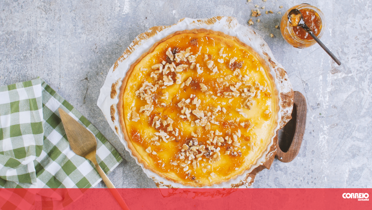 Aproveite o fim de semana que se aproxima para aquecer as tardes frias com um chá quente e uma fatia desta deliciosa tarte de requeijão com doce de abóbora com noz.